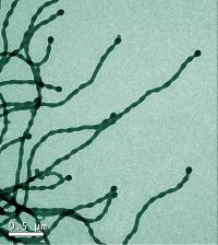 Transmission electron microscopy image of one-dimensional assembled structures created by a research team from the University of Delaware and the University of Washington in St. Louis. Researchers from the University of Delaware and Washington University in St. Louis have figured out how to train synthetic polymer molecules to behave--to literally “self-assemble” --and form into long, multicompartment cylinders 1,000 times thinner than a human hair, with potential uses in radiology, signal communication and the delivery of therapeutic drugs in the human body.