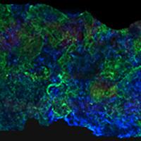 A microscopic image of a 10 mm collagen scaffold containing a uniform distribution of skin cells (blue) seeded on top of a 3-D polylysine gradient (green). Engineers at Georgia Tech have used skin cells to create artificial bones that mimic the ability of natural bone to blend into other tissues such as tendons or ligaments. The artificial bones display a gradual change from bone to softer tissue rather than the sudden shift of previously developed artificial tissue, providing better integration with the body and allowing them to handle weight more successfully. The research appears in the August 26, 2008, edition of the Proceedings of the National Academy of Sciences.